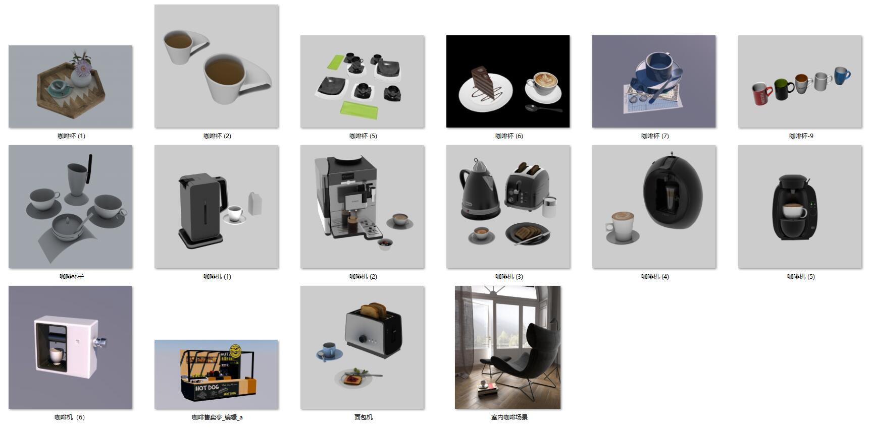 17个 咖啡杯 面包 售卖亭c4d模型免费下载